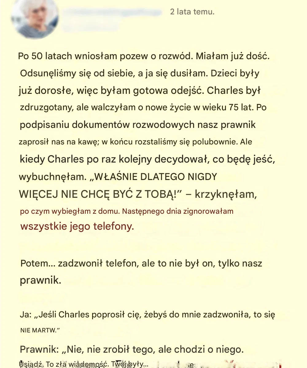 Charles był załamany, ale ja walczyłam o nowe życie w wieku 75 lat. Po podpisaniu dokumentów rozwodowych nasz prawnik zaprosił nas na kawę; w końcu postanowiliśmy rozstać się polubownie.